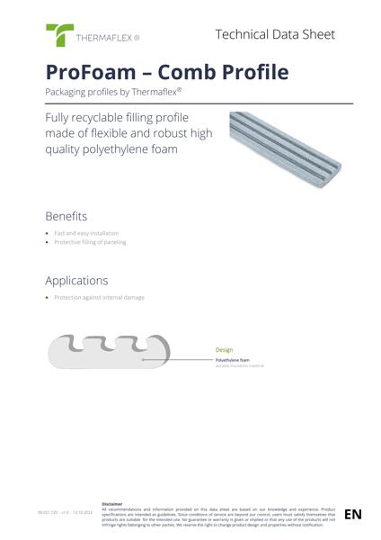 Документът представя гребеновия профил ProFoam - напълно рециклируем опаковъчен профил на Thermaflex, изработен от гъвкава и издръжлива полиетиленова пяна. Той е предназначен за защитно запълване на панели и предотвратяване на вътрешни повреди. Материалът се отличава с фина затворена клетъчна структура, неутрална миризма, сив цвят и плътност 26-31 kg/m³. Термичните свойства включват максимална работна температура от +95 °C и липса на експлозивни характеристики. Продуктът се предлага на рула с определени размери, допуски и продажни единици, както е посочено в техническите таблици.