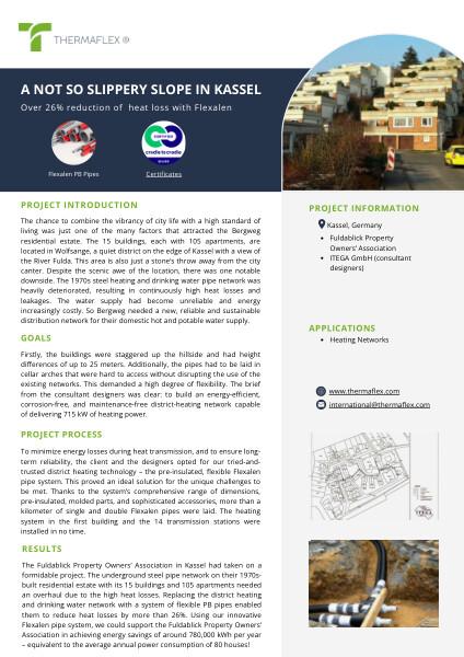 Fuldablick Property Owners' Association i Kassel opgraderede deres varme- og vandnetværk fra 1970'erne ved hjælp af Flexalen-rør, hvilket reducerede varmetabet med over 26% og sparede 780.000 kWh årligt.