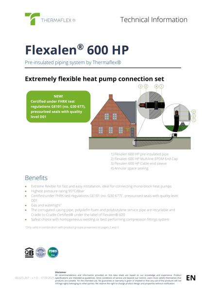 Teknisk dokument, der præsenterer Flexalen 600 HP præisoleret rørsystem til varmepumpetilslutninger. Indeholder fordele, anvendelser, produktspecifikationer, tilbehør og certificeringsoplysninger under FHRK GE101.