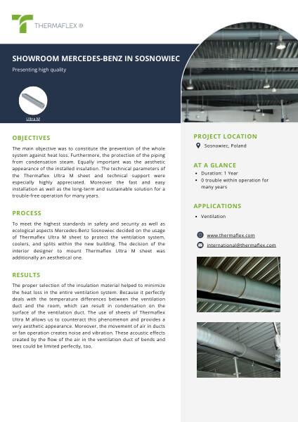 La sala de exposiciones de Mercedes-Benz en Sosnowiec (Polonia) instaló láminas Thermaflex Ultra M para proteger su sistema de ventilación, refrigeradores y splits. Esta decisión obedeció a la necesidad de cumplir normas de seguridad y ecológicas estrictas y, al mismo tiempo, lograr un aspecto estético. El material aislante se eligió por su capacidad para minimizar la pérdida de calor, evitar la condensación y reducir el ruido y las vibraciones en el sistema de ventilación. El proyecto, completado en un año, dio como resultado una solución sostenible y eficiente, que garantiza un funcionamiento sin problemas durante muchos años.