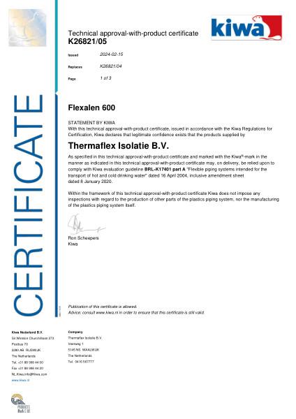 Este certificado de aprobación técnica con producto, emitido por Kiwa el 15 de febrero de 2024, certifica que Flexalen 600, suministrado por Thermaflex Isolatie B.V., cumple los requisitos de BRL-K17401 parte A para sistemas de tuberías flexibles utilizados en el transporte de agua potable caliente y fría. El producto incluye tuberías interiores de PB, aislamiento de PE y manguitos de HDPE, con accesorios para diversos métodos de conexión. El sistema está diseñado para una vida útil de 50 años en condiciones específicas de temperatura y presión. El certificado garantiza el cumplimiento de las normas de higiene para el agua potable y exige el marcado con la marca Kiwa.