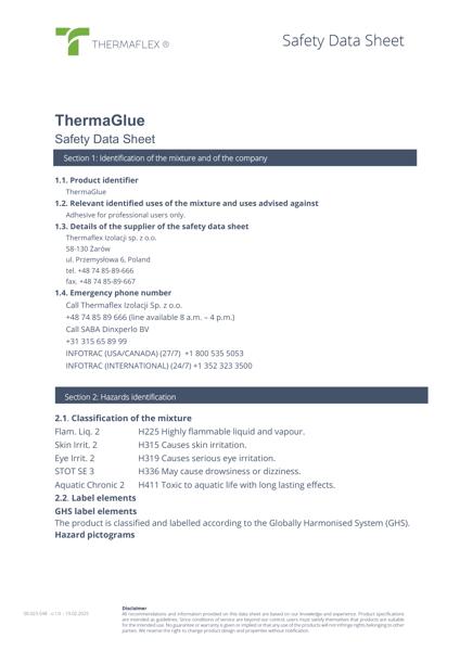Fiche de données de sécurité pour l'adhésif ThermaGlue utilisé par les professionnels, fournie par Thermaflex Izolacji. Contient des informations sur les dangers, la manipulation, le stockage et les mesures d'urgence.