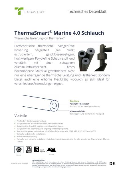 Le tube ThermaSmart Marine 4.0 est un produit d'isolation thermique sans halogène, composé d'une mousse élastomère de polyoléfine et d'une feuille d'aluminium noire, adapté aux applications marines et de chauffage, ventilation et climatisation.