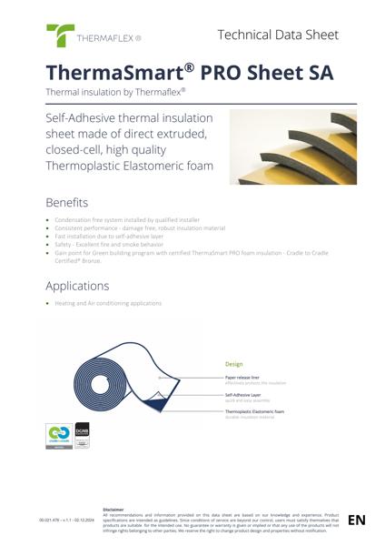ThermaSmart PRO Sheet SA est une feuille d'isolation thermique auto-adhésive en mousse thermoplastique élastomère de haute qualité, conçue pour les applications de chauffage et de climatisation, offrant un excellent comportement au feu et à la fumée.