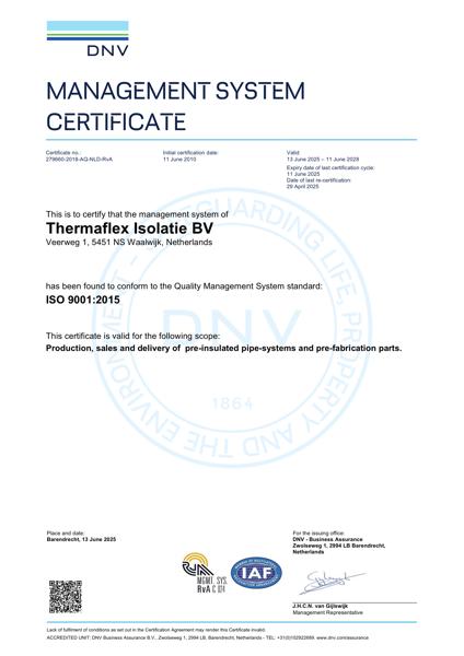 Het ISO 9001:2015-certificaat voor Thermaflex Isolatie BV, afgegeven op 10 juni 2022, bevestigt dat wordt voldaan aan de normen voor kwaliteitsbeheer voor het produceren en leveren van voorgeïsoleerde leidingsystemen in Nederland.