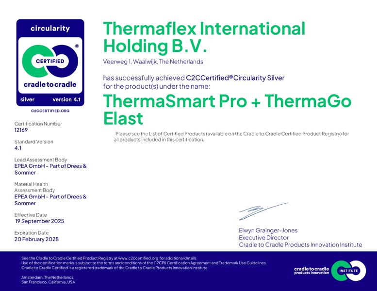 Niniejszy certyfikat potwierdza, że Thermaflex International Holding B.V. uzyskał certyfikat Cradle to Cradle Certified® Silver dla produktów ThermaSmart Pro + ThermaGo Elast. Certyfikat, wydany przez Cradle to Cradle Products Innovation Institute, jest ważny od 19 września 2025 do 20 lutego 2028 roku. Został on oceniony przez EPEA GmbH - część Drees & Sommer, zgodnie ze standardem w wersji 4.1. Certyfikat potwierdza zgodność z kryteriami dotyczącymi zdrowia materiałów, obiegu zamkniętego i zrównoważonego rozwoju. Dokument upoważnia do używania znaku Cradle to Cradle Certified® zgodnie z umową certyfikacyjną i wytycznymi dotyczącymi znaków towarowych.