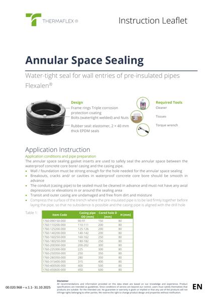 This document provides detailed instructions on sealing annular spaces for wall entries of pre-insulated pipes with Flexalen. It includes necessary tools, preparation steps, and a step-by-step guide to ensure a water-tight seal. The process involves drilling, using PVC pipe sleeves, applying epoxy resin, and tightening annular space sealing nuts. Specific torque values for different bolt sizes are provided to ensure proper installation.